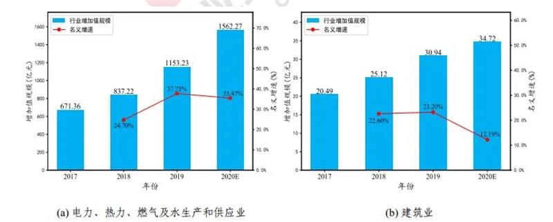 工業互聯網賦能能源行業,推動能源“四個革命”。如下圖­(a) 所示,據測算, 2019 年,工業互聯網帶動電力、熱力、燃氣及水生產和供應業的增加值規模為 1153.23 億元,名義增速達到 37.75%,增速同比提升 10.46%, 在四大工業行業中增速顯著、 發展潛力巨大;帶動就業 90.63 萬人。預計2020 年,工業互聯網帶動電力、熱力、燃氣及水生產和供應業的增加值規模為 1562.27 億元,名義增速仍將保持在 35.47%, 將成為唯一一個增速超過 25% 的行業,新增就業人數 25.40 萬人,帶動就業人數將達到 116.03萬人。