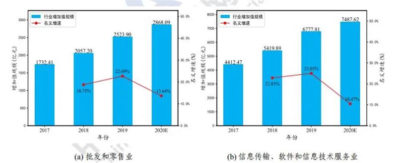 工業互聯網推動制造業與批發零售業的融通發展。如下圖a所示,據測算, 2019 年,工業互聯網帶動批發和零售業的增加值規模為 2523.90億元,名義增速為 22.69%,增速同比提升 3.32%;帶動就業 198.34 萬人。預計 2020 年,工業互聯網帶動批發和零售業的增加值規模為 2868.09 億元,新增就業人數 14.67 萬人,帶動就業人數將達到 213.01 萬人,成為制造業和信息產業之后, 第三個由工業互聯網帶動就業人數超過 200 萬人的產業。