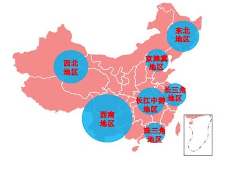 重點區域協同推進工業互聯網發展。近年來,《京津冀協同發展規劃綱要》、《長江三角洲區域一體化發展規劃綱要》、《長江經濟帶發展規劃綱要》和《粵港澳大灣區發展規劃綱要》等政策的發布,為各大重點區域的協調發展提供了政策指南(我國的重點區域分布如下圖所示)。