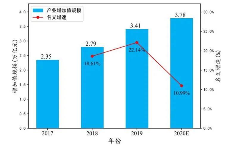 我國工業互聯網產業增加值規模持續擴大。據測算, 2019 年我國工業互聯網產業增加值規模達到 3.41 萬億元,名義增速達到 22.14%,增速同比增長 2.97 個百分點,其中工業互聯網直接產業增加值規模為 0.92 萬億元,名義增速達到 19.86%,增速同比增長 3.96 個百分點,工業互聯網滲透產業增加值規模為 2.49 萬億元,名義增速達到 23.01%,增速同比增長 2.57 個百分點。在抗擊新冠肺炎疫情過程中, 社會各界進一步加深對工業互聯網的認識,如下圖所示,預計 2020 年,工業互聯網產業增加值規模達到 3.78 萬億元,成為促進我國 GDP 增長的重要因素。