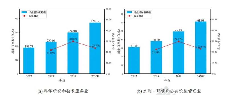 在科學研究和技術服務業,如下圖­(a) 所示,據測算, 2019 年,工業互聯網帶動科學研究和技術服務業的增加值為 299.04 億元,名義增速為 30.01%;帶動就業人數 23.50 萬人。預計 2020 年,工業互聯網帶動科學研究和技術服務業的增加值規模為 370.18 億元,新增就業人數 3.99 萬人,帶動就業人數將達到 27.49 萬人。