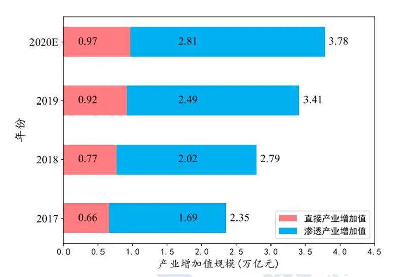 據測算,工業互聯網滲透產業增加值規模和工業互聯網直接產業增加值規模的比值從 2017 年的 2.56 增加到 2019 年的 2.71,預計 2020 年,該比值將達到 2.90,滲透產業增加值規模占總增加值規模的比例將達到 74.34%。如下圖所示,滲透產業增加值規模顯著高于直接產業增加值規模,這表明我國工業互聯網正在加速同各行業深度融合,促進一二三產業融通發展。