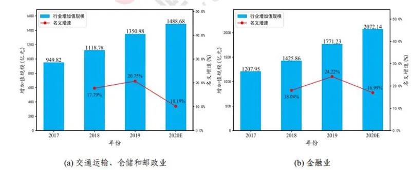 ▲工業互聯網帶動交通運輸、倉儲和郵政業,金融業的增加值規模