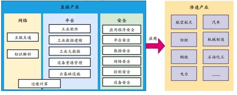 工業互聯網為實體經濟各個領域的轉型升級提供具體的實現方式和推進抓手,為產業變革賦能。 工業互聯網的產業體系包括直接產業和滲透產業。工業互聯網直接產業由網絡、平臺、安全三個部分構成,其中網絡是基礎、平臺是核心、安全是保障。如圖 1所示,“網絡”是實現各類工業生產要素泛在深度互聯的基礎,包括網絡互聯互通體系和標識解析體系。
