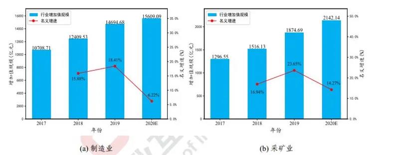 工業互聯網賦能礦產開采,保障采礦業安全生產運行。如上圖­(b) 所示,據測算, 2019 年,工業互聯網帶動采礦業的增加值規模為 1874.69 億元,名義增速為 23.65%,增速同比提升 5.74%? 帶動就業 147.32 萬人。預計 2020 年,工業互聯網帶動采礦業的增加值規模為 2142.14 億元,新增就業人數 11.78 萬人,帶動就業人數將達到 159.10 萬人。我國采礦業規模大、分布范圍廣、生產危險性強,應用工業互聯網,可以推動采礦業數字化、網絡化、智能化建設,同樣也實現了采礦業安全與發展相協調的要求。