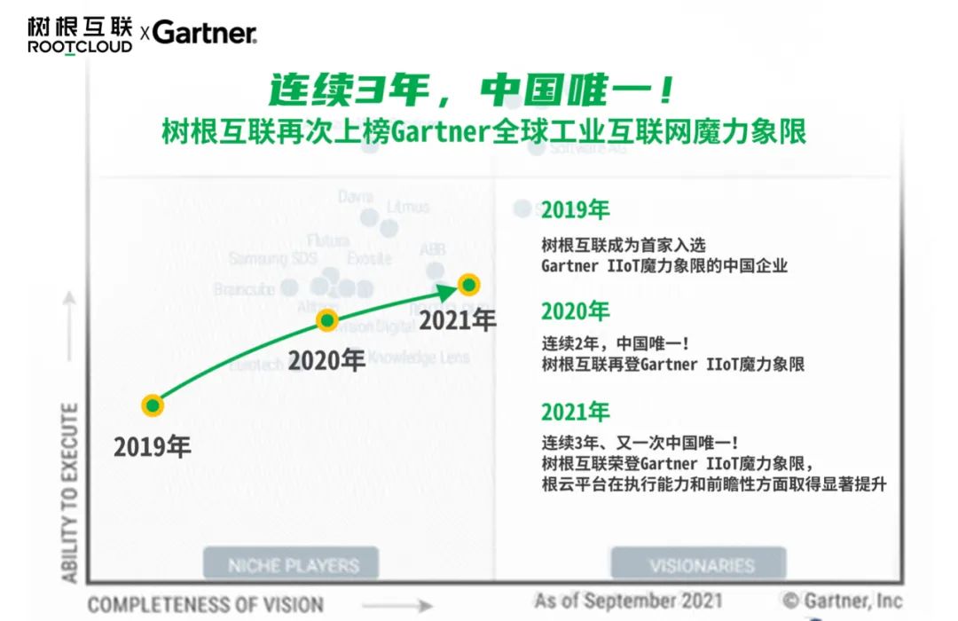 從樹根科技三年來在魔力象限中的位置變化可見,樹根科技根云平臺的前瞻性與執行能力愈發突出,穩居特定領域的佼佼者
