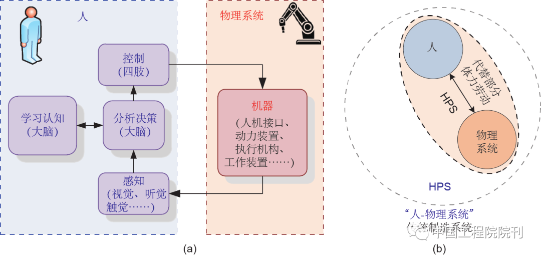 傳統(tǒng)制造系統(tǒng)包含人和物理系統(tǒng)兩大部分,是完全通過人對(duì)機(jī)器的操作控制去完成各種工作任務(wù)[如圖2(a)所示]。動(dòng)力革命極大地提高了物理系統(tǒng)(機(jī)器)的生產(chǎn)效率和質(zhì)量,物理系統(tǒng)(機(jī)器)代替了人類大量體力勞動(dòng)。傳統(tǒng)制造系統(tǒng)中,要求人完成信息感知、分析決策、操作控制以及認(rèn)知學(xué)習(xí)等多方面任務(wù),不僅對(duì)人的要求高,勞動(dòng)強(qiáng)度大,而且系統(tǒng)工作效率、質(zhì)量還不夠高,完成復(fù)雜工作任務(wù)的能力還很有限。傳統(tǒng)制造系統(tǒng)可抽象描述為圖2(b)所示的“人-物理系統(tǒng)”(human-physical systems,HPS)。