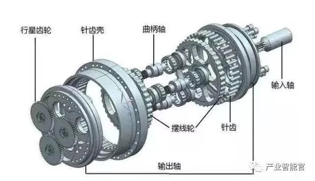 RV減速器:是少齒差嚙合,但相對于諧波減速器,RV減速器通常用的是擺線針輪,RV減速器由擺線針輪和行星支架組成。相比諧波減速器,RV減速器的關鍵在于加工工藝和裝配工藝。RV減速器具有更高的疲勞強度、剛度和壽命,不像諧波傳動那樣隨著使用時間增長,運動精度會顯著降低,其缺點是重量重,外形尺寸較大。RV減速器用于轉矩大的機器人腿部腰部和肘部三個關節,負載大的工業機器人,一二三軸都是用RV減速器。