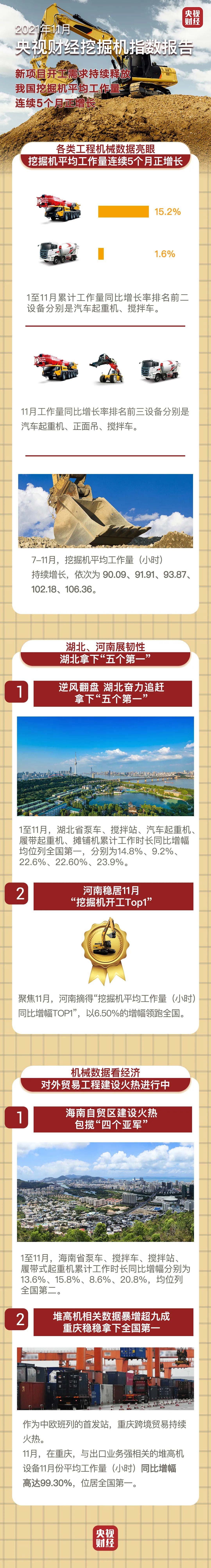 挖掘機指數(shù)顯示,1-11月,海南省泵車、攪拌車、攪拌站、履帶式起重機累計工作時長同比增幅位列全國第二、第二、第二、第二,包攬“四個亞軍”!