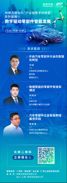 202268在廣州市鏈長制辦公室(廣州市工業(yè)和信息化局)的指導(dǎo)下,樹根科技聯(lián)合ATC汽車技術(shù)平臺,舉辦樹根科技助力產(chǎn)業(yè)鏈數(shù)字化轉(zhuǎn)型系列直播之數(shù)字驅(qū)動零部件智能發(fā)展活動。特邀樹根科技、全球TOP10零部件企業(yè)數(shù)字化專家,線上為聽眾帶來汽車零部件企業(yè)的數(shù)字化轉(zhuǎn)型分享。