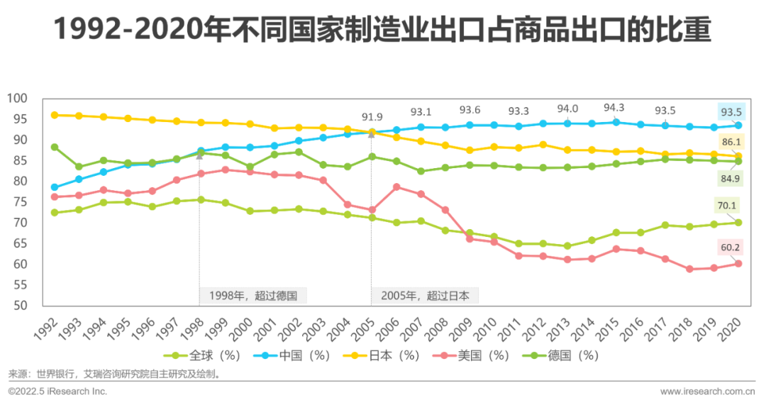 從世界銀行公布的制造業(yè)出口數(shù)據(jù)來看,中國制造業(yè)出口占商品出口的比重(以下簡稱制造業(yè)出口)從1992年開始,就已經(jīng)超過全球、美國,并于1998年超過德國、2005年與日本持平。從2006年開始,中國制造業(yè)出口一直維持第一的位置,是當之無愧的制造業(yè)生產(chǎn)及出口大國。2020年,中國、日本、德國制造業(yè)出口分別為93.5%86.1%84.9%,中國的制造業(yè)出口優(yōu)勢依然比較明顯。