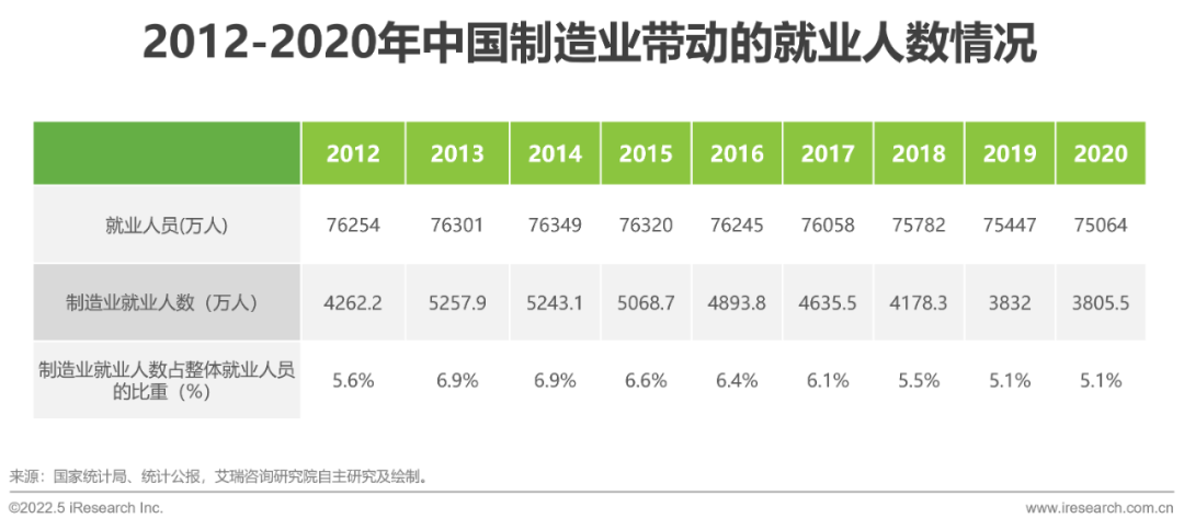 由國家統(tǒng)計局公布的數(shù)據(jù)來看,2020年,全國就業(yè)人員7.5億人,其中,制造業(yè)就業(yè)人員為3805.5萬人,占比為5.1%。縱觀近10年制造業(yè)的就業(yè)人員情況,制造業(yè)企業(yè)帶動的就業(yè)人員基本維持在6%左右,對國內(nèi)就業(yè)市場的穩(wěn)定貢獻功不可沒。