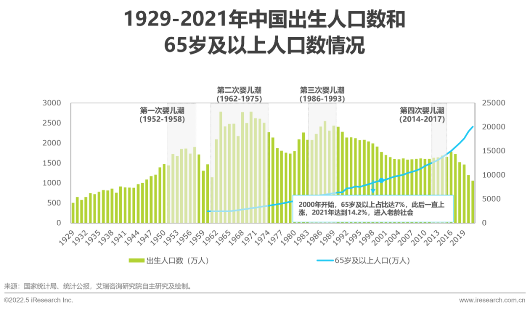 針對老齡人口:2000年開始,中國65歲及以上的人口占比達7%,此后便一直上漲,在2021年達到14.2%,中國進入老年社會。