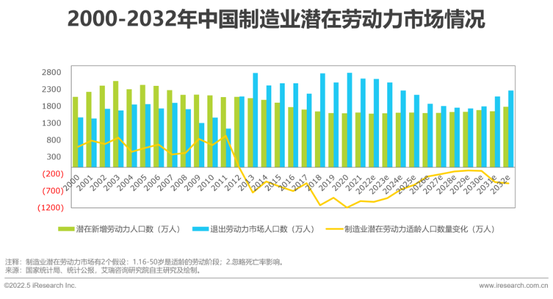 針對制造潛在勞動力市場:2012年開始,中國制造業(yè)的潛在勞動力適齡人口數(shù)量變化(即潛在新增勞動力人口數(shù)與退出勞動力市場人口數(shù)之差)為負數(shù),持續(xù)到2021年底,制造業(yè)潛在勞動力市場平均每年減少700萬左右的適齡人口,并且制造業(yè)潛在勞動力市場的適齡人口將持續(xù)減少的現(xiàn)象或?qū)⒕S持10年以上,帶來的影響可能就是行業(yè)潛在勞動力不足或者制造業(yè)企業(yè)需要提供更具吸引力的工作環(huán)境、工作福利等來吸引年輕群體。