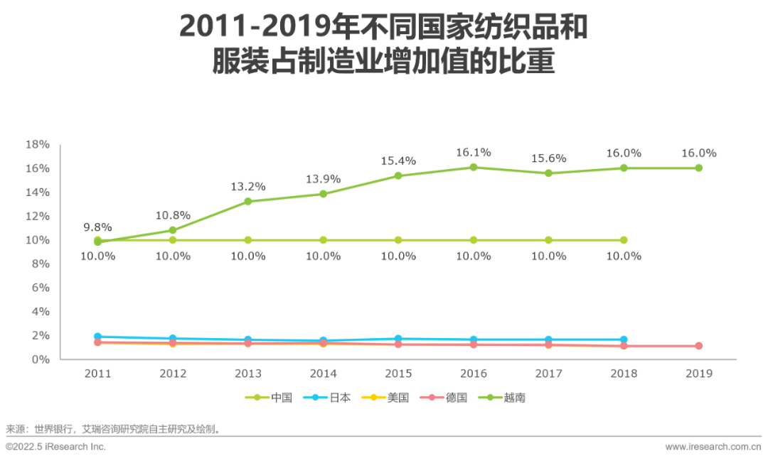 目前產(chǎn)業(yè)向成本更低的國家(如越南)轉(zhuǎn)移。以紡織品和服裝為例:據(jù)世界銀行公布的數(shù)據(jù),目前中國的紡織品和服裝占制造業(yè)的比重基本維持在10%,但是越南則呈明顯上升趨勢,2019年,越南的紡織品和服裝占制造業(yè)的比重高達16%。結(jié)合歷史上前4次制造業(yè)轉(zhuǎn)移的兩個主要特點(向成本更低的國家或地區(qū)轉(zhuǎn)移、從技術(shù)相對低端的行業(yè)逐步滲透至相對高端的行業(yè))來看,制造業(yè)遷移的苗頭已經(jīng)顯現(xiàn),國內(nèi)制造業(yè)需要引起重視。