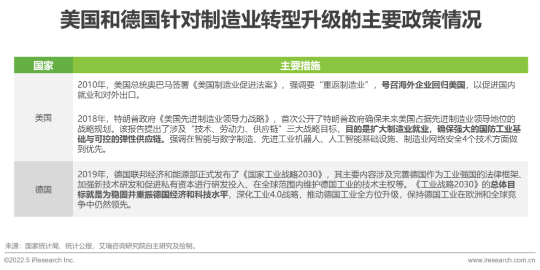 發(fā)達國家紛紛出臺政策引導制造業(yè)回流并轉(zhuǎn)型升級,如美國和德國。美國奧巴馬政府和特朗普政府都出臺相關(guān)政策表示要重返制造業(yè),同時,還強調(diào)要在技術(shù)、供應鏈等方面發(fā)力,確保美國占據(jù)先進制造業(yè)的領(lǐng)導地位。德國則在2019年就提出《國家工業(yè)戰(zhàn)略2030》,并在次年將工業(yè)4.0升級為全國戰(zhàn)略,旨在保證就業(yè)的同時,要在全球范圍內(nèi)維護德國工業(yè)的技術(shù)主權(quán)、保持德國工業(yè)在歐洲和全球競爭中的領(lǐng)先地位、轉(zhuǎn)型升級為智能制造。