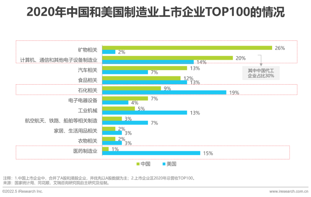 對比2020年中國和美國營收TOP100的制造業(yè)上市企業(yè)數(shù)據(jù),中國的制造業(yè)企業(yè)更為集中,礦物相關(guān)(26%計算機、通信和電子設(shè)備制造業(yè)(20%汽車相關(guān)(13%TOP3大類,占比之和達59%。值得注意的是,計算機、通信和電子設(shè)備制造業(yè)中,以代工為主的企業(yè)占比30%,這也側(cè)面說明中國的制造業(yè)缺少核心技術(shù)。反觀美國,石化相關(guān)醫(yī)藥制造業(yè)計算機、通信和電子設(shè)備制造業(yè)TOP3大類,占比之和為48%,其產(chǎn)業(yè)結(jié)構(gòu)更為分散。
