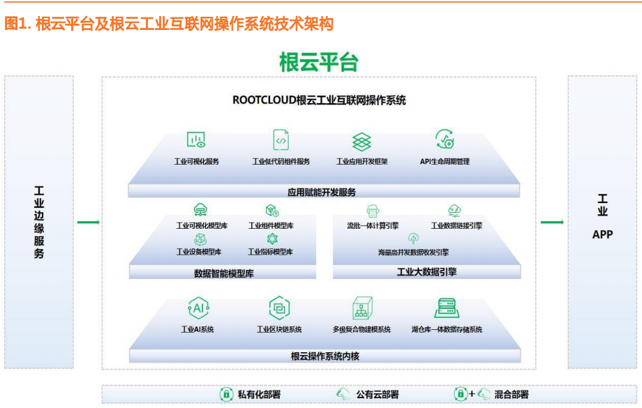 根云平臺著力于強(qiáng)化工業(yè)互聯(lián)網(wǎng)平臺縱深,是幫助工業(yè)企業(yè)打造從設(shè)備接入、物聯(lián)呈現(xiàn)到行業(yè)應(yīng)用的端到端深度價值解決方案的運營平臺,為工業(yè)企業(yè)落地工業(yè)互聯(lián)網(wǎng)提供端到端成本最低、效率最優(yōu)、可靠性最強(qiáng)的解決方案。根云工業(yè)互聯(lián)網(wǎng)操作系統(tǒng)是根云平臺的核心,包括操作系統(tǒng)內(nèi)核、工業(yè)大數(shù)據(jù)引擎、數(shù)據(jù)智能模型庫和應(yīng)用賦能開發(fā)服務(wù)四大組成部分,具備完整的操作系統(tǒng)能力;工業(yè)邊緣服務(wù)提供工業(yè)設(shè)備及生產(chǎn)要素的連接、數(shù)據(jù)采集和邊緣計算等服務(wù);工業(yè) APP是數(shù)據(jù)驅(qū)動的工業(yè)應(yīng)用。
