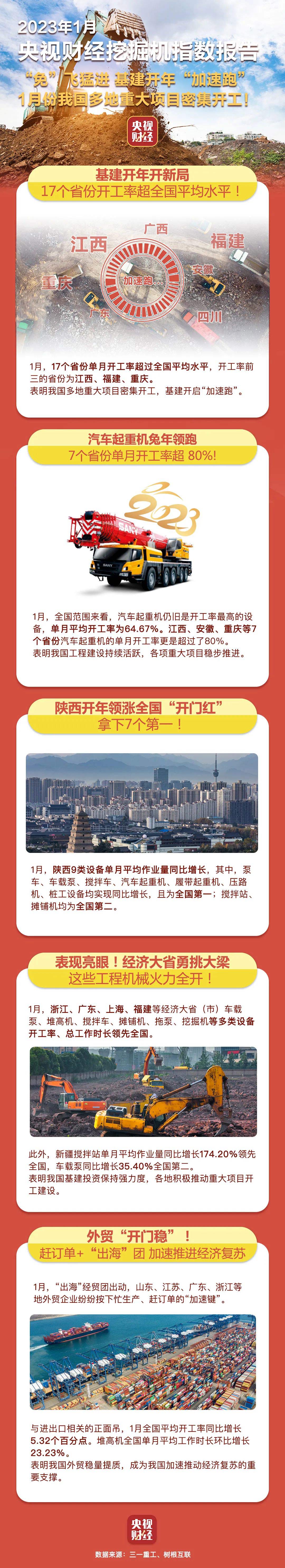 挖掘機(jī)是基礎(chǔ)設(shè)施建設(shè)的“標(biāo)配”,是反映基礎(chǔ)設(shè)施建設(shè)、觀(guān)察固定資產(chǎn)投資等經(jīng)濟(jì)變化的風(fēng)向標(biāo)。央視財(cái)經(jīng)與三一重工、樹(shù)根互聯(lián)聯(lián)合打造的“央視財(cái)經(jīng)挖掘機(jī)指數(shù)”今天發(fā)布了最新相關(guān)數(shù)據(jù)。今年1月份,全國(guó)各省份馬不停蹄開(kāi)始了經(jīng)濟(jì)“大比拼”,多地重大項(xiàng)目密集開(kāi)工,基建開(kāi)啟“加速跑”,力爭(zhēng)為兔年經(jīng)濟(jì)開(kāi)好頭、起好步。