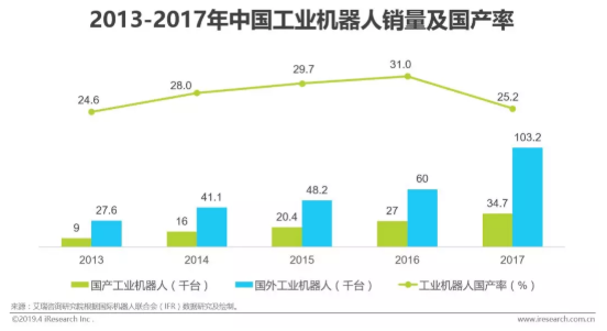 以工業機器人為例,中國已經連續六年成為工業機器人第一消費大國,2017年中國工業機器人銷量達到了13.8萬臺,全球占比達到36%。而其中僅有3.5萬臺是由國內工業機器人制造商生產,國產率僅為25.2%,比2016年的31%還下降了近6個百分點。