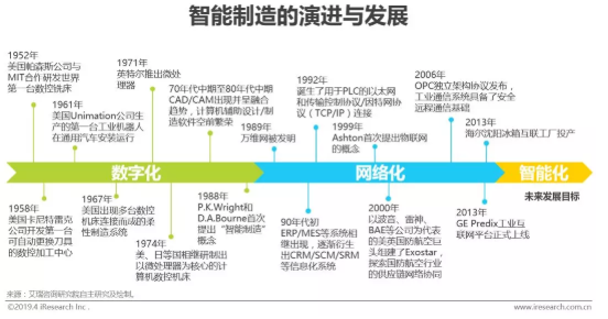 智能制造代表著先進制造技術與信息化的融合,盡管概念提出至今僅30年的時間,但智能制造的起源可以追溯至上世紀中葉,其發展與演進可以大致分為三個階段: