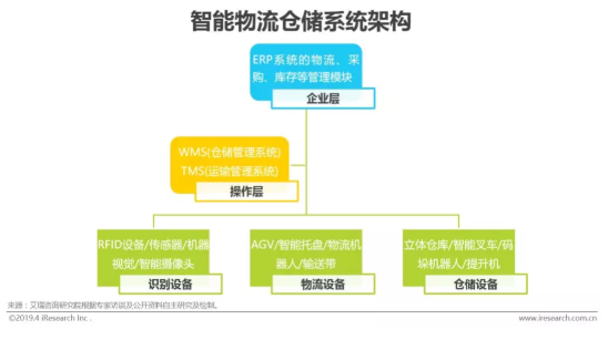 智能物流倉儲系統盡管不直接參與產品的生產,但作為整個智能制造系統中的重要子系統,其組成架構也與之類似,分為設備層、操作層、企業層,設備層包括倉儲設備、物流設備、識別設備;操作層由WMS、WCS、TMS等軟件構成;企業層則對接ERP、CRM、SCM等管理軟件的采購、計劃、庫存、發貨等模塊,融入總系統的閉環中。