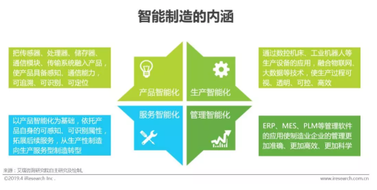 艾瑞認為,智能制造是通過新一代信息技術、自動化技術、工業軟件及現代管理思想在制造企業全領域、全流程的系統應用而產生的一種全新的生產方式。智能制造的應用能夠使制造業企業實現生產智能化、管理智能化、服務智能化與產品智能化。