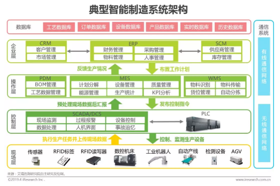 智能“神經系統”以ERP(企業資源計劃系統)、MES(生產過程執行系統)等管理軟件組成中樞神經,以傳感器、嵌入式芯片、RFID標簽、條碼等組件為神經元,以PLC(可編程邏輯控制器)為鏈接控制神經元的突觸,以現場總線、工業以太網、NB-IoT等通信技術為神經纖維。