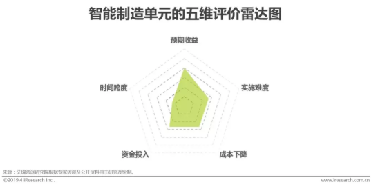 本部分對制造業企業生產活動中各個環節的六種典型智能制造能力從預期收益、實施難度、成本下降、資金投入、時間跨度五個維度進行分析評價,并以此為基礎提出智能化路徑示例。
