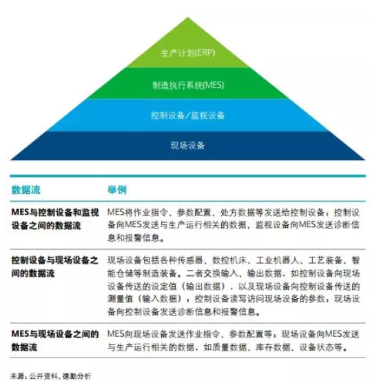 德勤調研結果顯示,目前企業致力于打通從ERP到MES乃至現場設備的數據流,但這也僅是從生產到執行的打通,未來 還需將產品數據、供應鏈數據串聯。我們將生產數據流分為兩個環節:一、打通生產計劃與執行系統的數據流;二、執行與監控和現場設備的數據流。