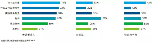 從行業應用來看,電子及電器行業傳感 器和平臺應用最為普及,76%的受訪企業利用傳感器采集數據,43%的企業利用物聯網平臺,但僅有33%的企業采用大數據技術分析所采集的數據。汽車及零部件制造行業傳感器技術應用也有較高普及率達73%,但大數據和平臺應用低于其他受訪行業。制藥行業大數據技術利用最為積極,因為醫藥行業早已面臨海量數據和非結構化數據挑戰(見下圖)。