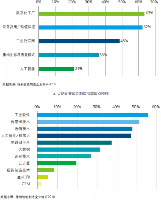 德勤調查發現,中國工業企業智能制造五大部署重點依次為:數字化工廠(63%)、設備及用戶價值深挖(62%)、工業物聯網(48%)、重構商業模式(36%)以及人工智能(21%)。