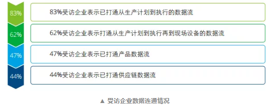 結果顯示, 83%的受訪企業表示已打通ERP和MES的數據流打通。62%的企業繼續向 下打通MES到現場設備的數據流。但僅有47%的企業打通了產品數據流,44%的企業打通供應鏈數據流。而且考慮到我們調查的企業均為資質較好且為中等以上規模,這一系列比率顯然高于中國整體平均水平。