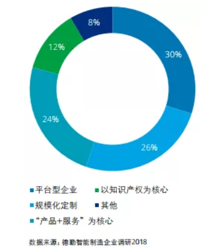 德勤調研發現企業對未來商業模式的規劃大致呈四類:30%的受訪企業未來商業模式將以平臺為核心,26%的企業走規模化定制模式,24%以“產品+服務”為核心向解決方案商轉型,12%以知識產權為核心(見下圖)。