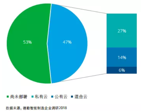 德勤調研發現,中國制造企業云部署積極性不高。53%的受訪制造企業尚未部署工業云,47%的企業正在進行工業云部署,其中27%的企業部署私有云,14%部署公有云,6%部署混合云(見下圖)。上云可以大幅降低每個單元的儲存和計算成本,甚至通過跨界創造新的商業模式,但也帶來了復雜性。企業擔心一旦將諸如工廠生產過程、資產性能管理的數據放到 云平臺上之后,信息安全、知識產權問題會接踵而至。除此之外,很多企業尚未明 確工業云在企業層面的商業應用和相關能力欠缺也是導致企業云部署積極性不高的原因。