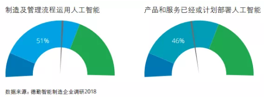 德勤智能制造調研發現,51%的受訪企業在制造和管理流程中運用人工智能,46% 的受訪企業在產品和服務領域已經或計劃部署人工智能(見下圖)。制造和管理流程中人工智能的運用更偏向系統自動化和制造精益化,目的是提高生產效率和產品質量,同時人也被解放出來,可以去思考更復雜的問題。