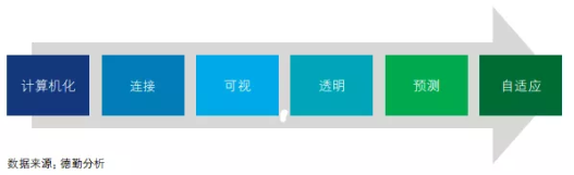企業數字化能力素質體現在其利用數據指導生產以及系統自優化的能力。我們借鑒國際普遍認可的工業4.0發展路徑,將企業智能化成熟度分為六個階段:計算機化、連接、可視、透明、預測和自適應。