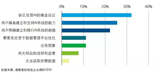當然人工智能仍處在其發展早期,技術突破及商業論證需要更長時間。另外,人工智能應用環境和基礎設施的完善程度,信息和安全法規、企業自身的能力都成為企業面臨的主要挑戰。我們發現,對于尚未部署人工智能的制造企業來說,缺乏投資人工智能的商業論證、尚不具備建立和支持人工智能的系統能力、尚不明確部署人工智能的前提為主要挑戰(見下圖)。