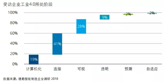 隨著中國兩化融合和工業物聯網建設等多項舉措推進,制造型企業數字化能力素質顯著提升,大部分企業正致力于數據縱向集成。德勤調研結果顯示,81%的受訪企業已完成計算機化階段,其中41% 處于連接階段,28%處于可視階段,9%處于透明階段,而預測和自適應階段的企業各自占2%。