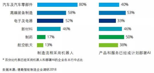人工智能正迅速滲透各行各業。汽車及汽車零部件制造、高端裝備制造、電子及電器制造三個行業在制造流程中采用機器人的比例過半。汽車及零部件制造行業使用機器人的企業比例達到80%,預示未來工業機器人的市場增量將主要來自非汽車行業。在產品和服務領域已經或計劃部署人工智能的行業分布比較均勻,高端裝備制造和制藥比例較高,但其他行業如新材料、汽車及零部件、航空航天、電子及電器也正在或計劃部署人工智能。