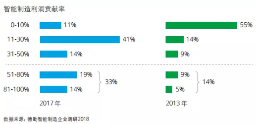 2013年智能制造為企業帶來的利潤并不明顯,55%的受訪企業其智能制造產品和服務凈利潤貢獻率處于0-10%的區間,而2017年,僅有11%的受訪企業處于這個區間,而41%的企業其智能制造利潤貢獻率在11-30%之間。利潤貢獻率超過50%的企業,由2013年受訪企業占比14%提升到2017年的33%。智能制造利潤貢獻率明顯提升,利潤來源包括生產過程中效率的提升和產品服務價值的提升。