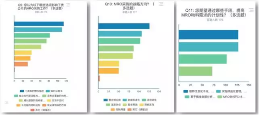 在如何提高需求計(jì)劃性期望措施的調(diào)研中:跟蹤物料需求和去向,建立MRO物料需求決策系統(tǒng),以強(qiáng)化使用單位的主體責(zé)任(76%);實(shí)施精益化管理,提高主動(dòng)性維修的比例,以提高M(jìn)RO物料采購的計(jì)劃性(76%);基于精準(zhǔn)數(shù)據(jù)分析下的預(yù)測(57%);前三項(xiàng)均在50%以上。數(shù)據(jù)顯示,用戶更期望通過數(shù)字化與互聯(lián)網(wǎng)手段解決現(xiàn)有MRO迫切的問題,同時(shí)對于精益化管理要求同步得到提升。